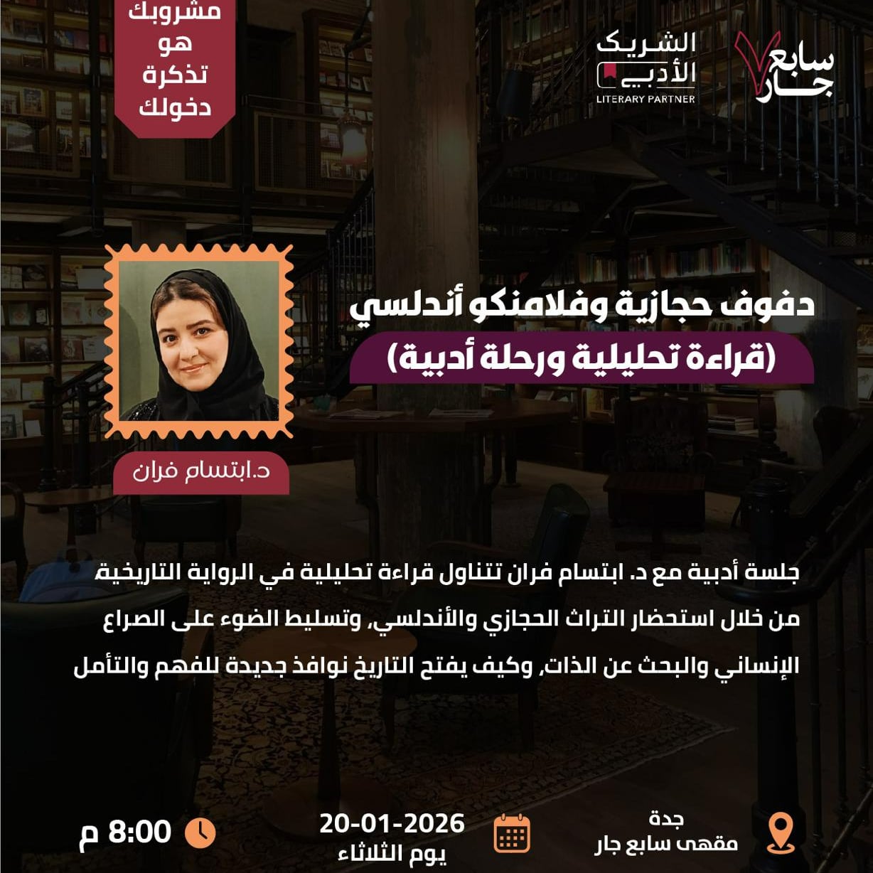 جلسة أدبية مع د. ابتسام فران تتناول قراءة تحليلية في الرواية التاريخية، من خلال استحضار التراث الحجازي والأندلسي، وتسليط الضوء على الصراع الإنساني والبحث عن الذات، وكيف يفتح التاريخ نوافذ جديدة للفهم والتأمل.