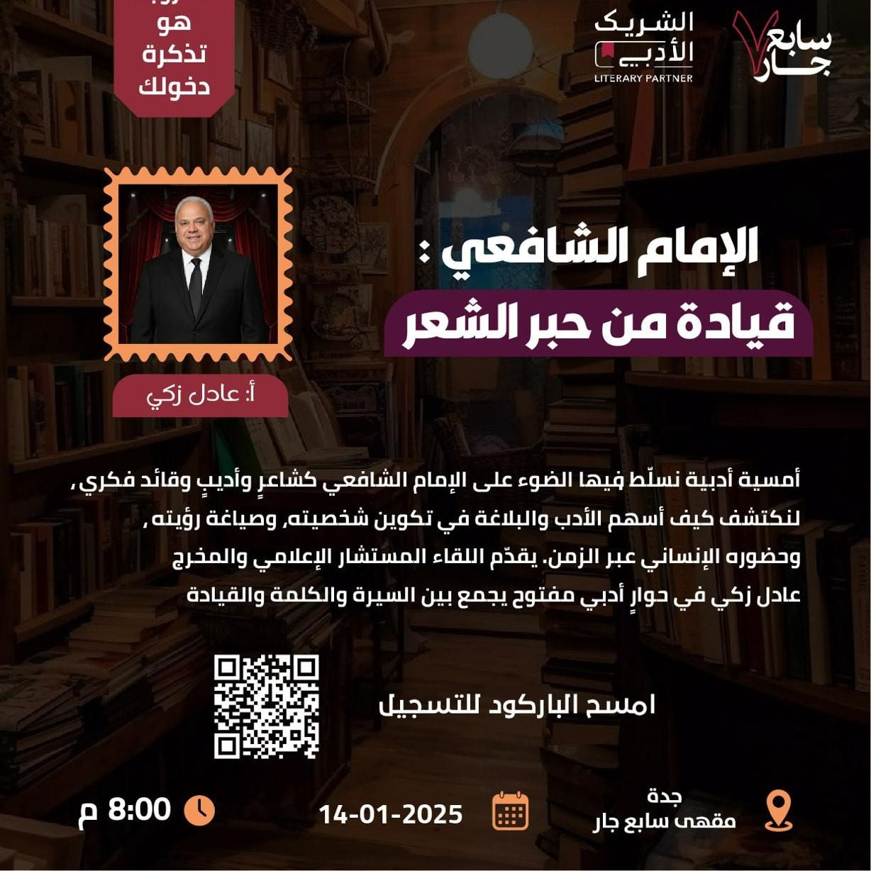 أمسية أدبية نسلّط فيها الضوء على الإمام الشافعي كشاعرٍ وأديبٍ وقائد فكري، لنكتشف كيف أسهم الأدب والبلاغة في تكوين شخصيته، وصياغة رؤيته، وحضوره الإنساني عبر الزمن. يقدّم اللقاء المستشار الإعلامي والمخرج عادل زكي في حوارٍ أدبي مفتوح يجمع بين السيرة والكلمة والقيادة